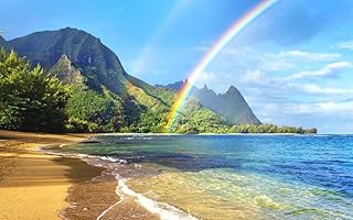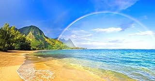 絵画風 壁紙ポスター (はがせるシール式) 南国の島とビーチと虹のハーモニー ハワイ 波 虹 レインボー 海 キャラクロ SRBW-008S1 (1105mm×576mm) 建築用壁紙+耐候性塗料